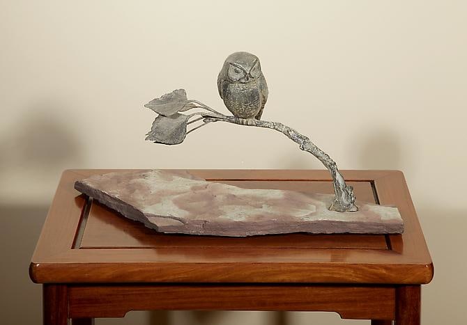 Pygmy Owl Cast bronze sculpture on stone base 9 1/2 x 10 x 19 inches Edition of 27 SOLD